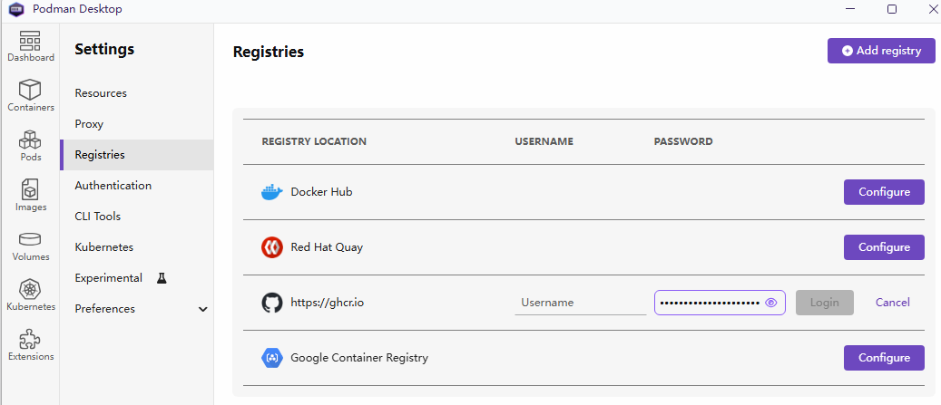 回到podman desktop,输入github的账户和获取的tokens(密码处),就可以正常登陆了。