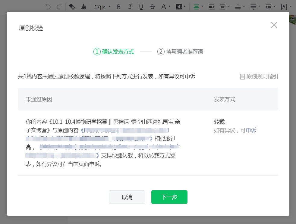 微信公众号微调后转发文章,是不是你遇到过这种提示,他会提示你会转为原文章发送,但是我调整过又不想用原文。怎么解决?