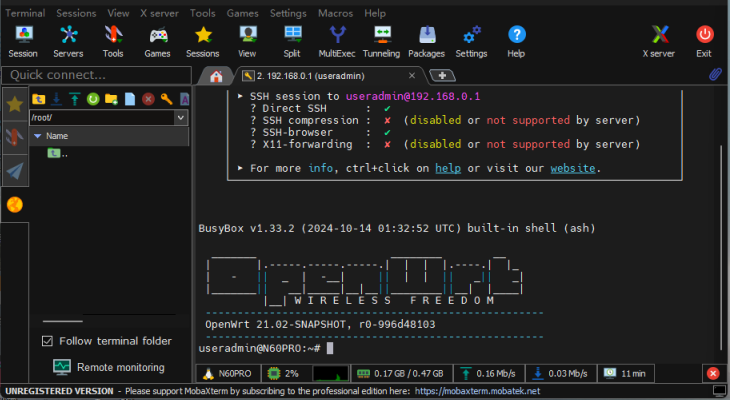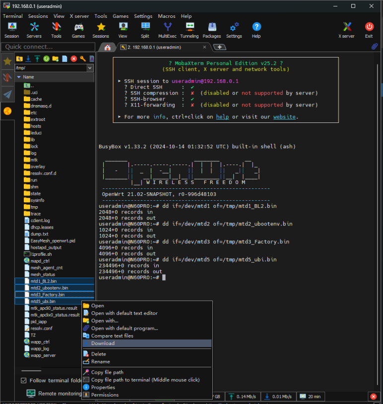 使用的是MobaXterm,这里注意一点就是,不是什么版本都适合,有的版本无法下载路由器文件。