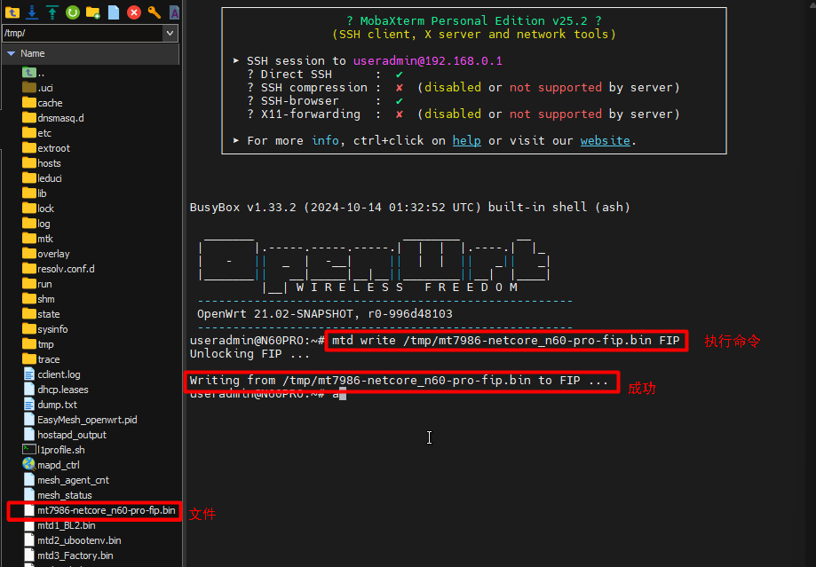 将文件中的mt7986-netcore_n60-pro-fip.bin文件拖进/tmp目录