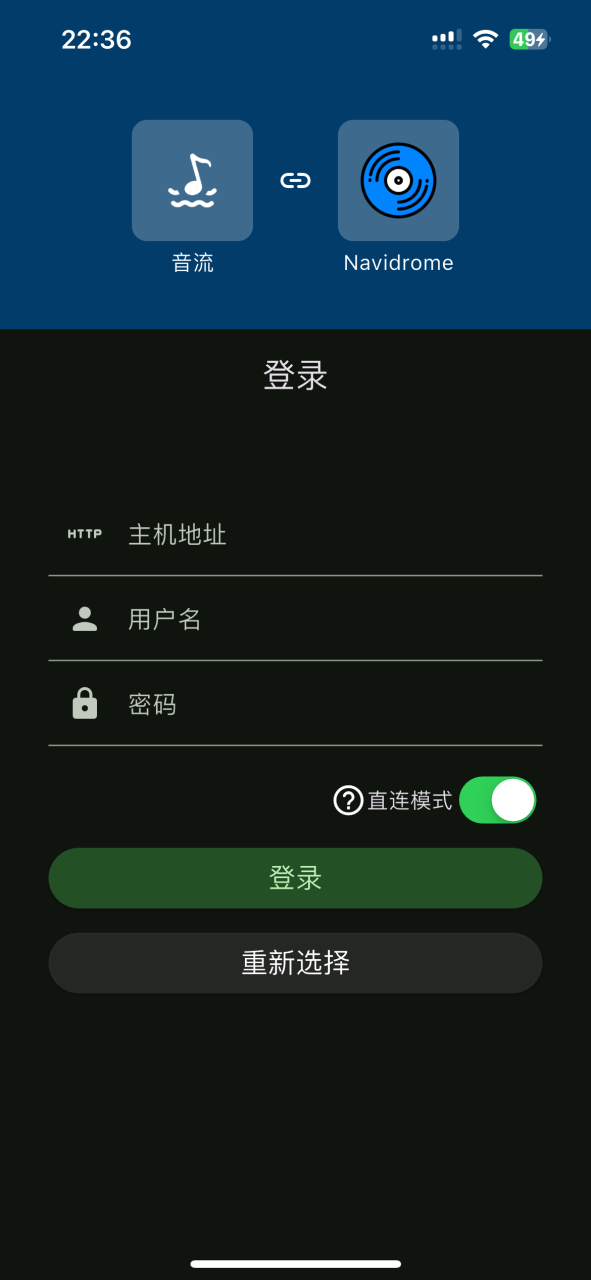 进入app后会有六项音乐服务选项,去选择Navidrome,然后输入服务地址(带端口号),填写 Navidrome设置的账户密码。