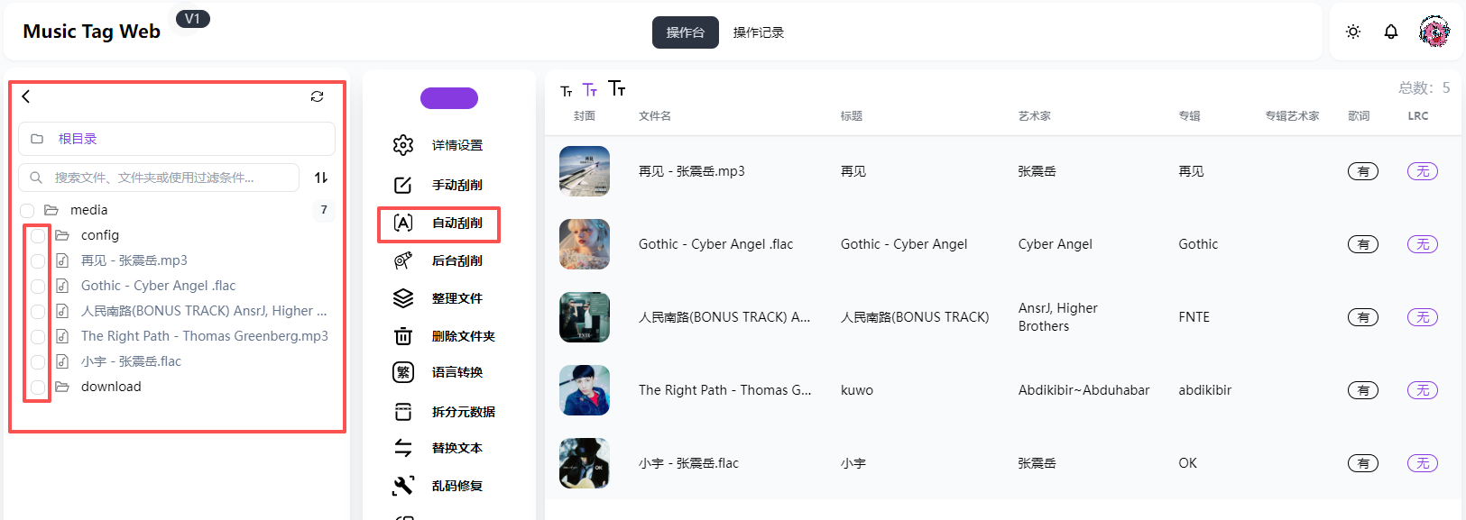 登录后在左侧有音乐文件路径,全选后选择“自动刮削”。然后出现“自动修改标签”确认就可以了。