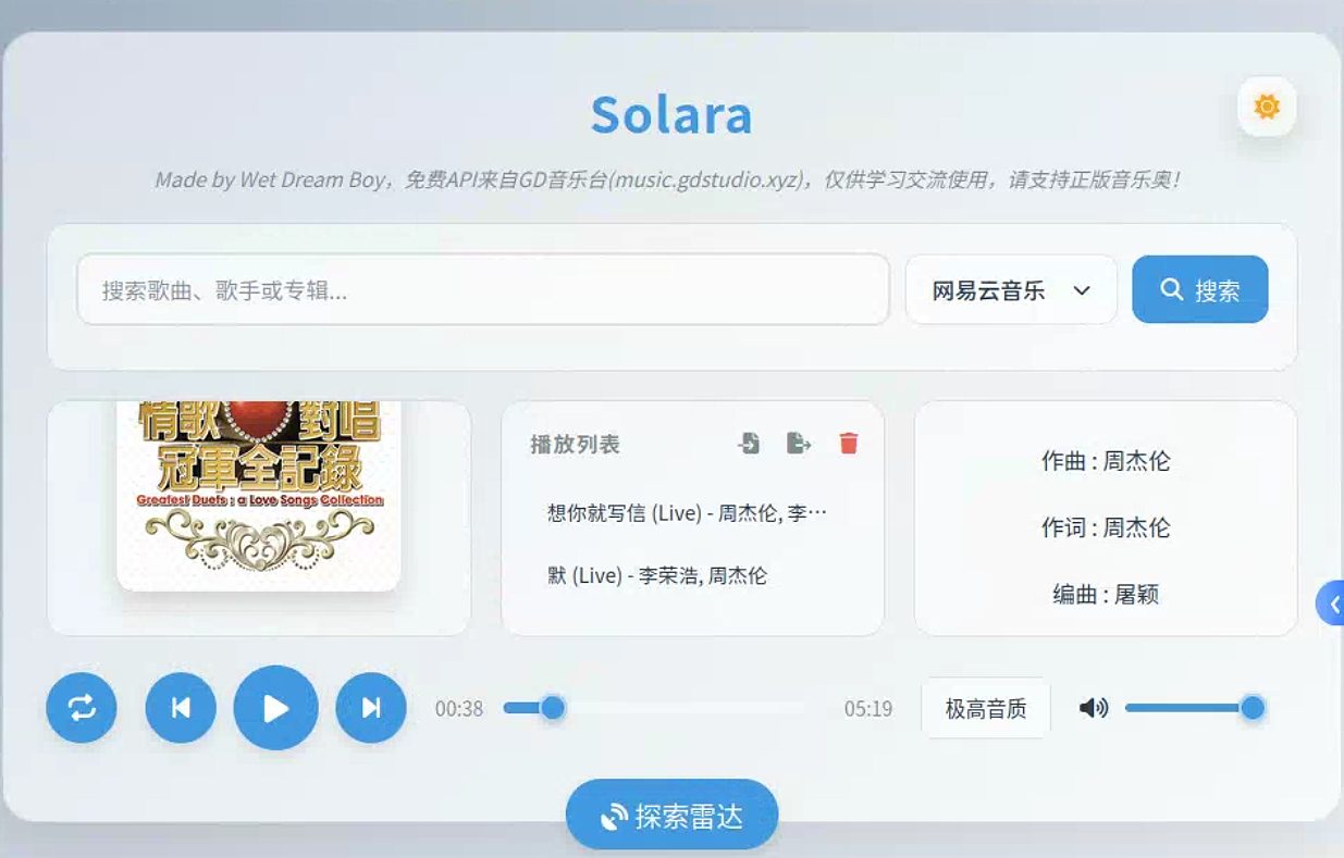 实用非常简单,如果你有明确想听的音乐就输入然后搜索,如果没有那就雷达探索,随机给你一些。