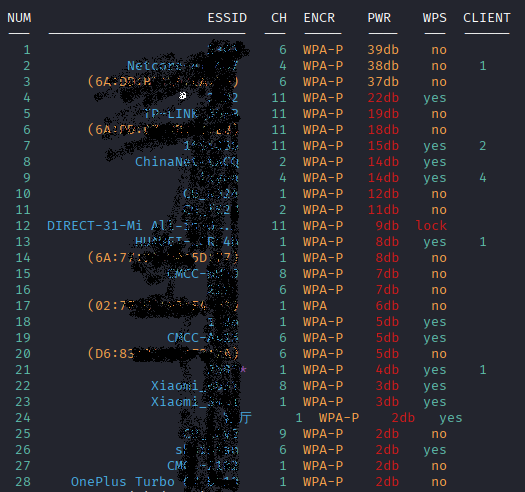 之后网卡进入监听模式,扫描周围WiFi信息。