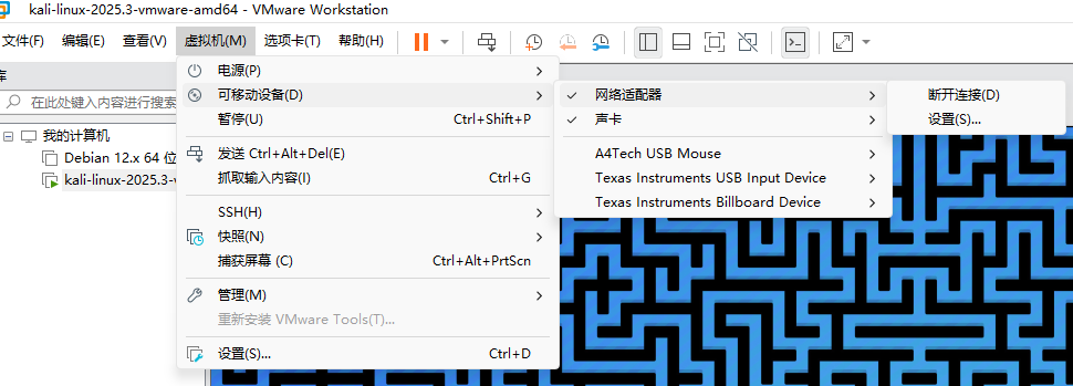 然后查看你的虚拟机能不能识别无线网卡,无线网卡需要具备监听功能,网上20多就能买到,标称支持kali的就可以。