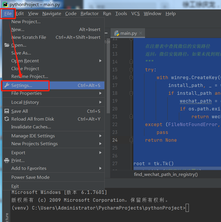 进入Pycharm,在项目界面点击File,然后如下图所示。