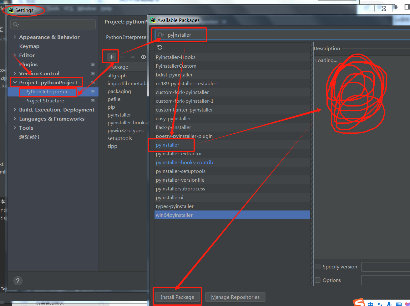 记住一点,就是点“Install Package”之前一定要等pyinstaller右侧的信息加载全,不然可能失败。